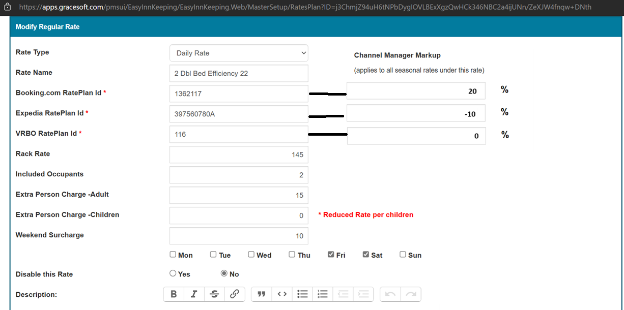 Go to Setup>Rate Setup. You will see the list of Regular Rates on your screen. To add the markup to any rate, click on the Rate Name, which will open the Modify Regular Rate screen. Each channel manager has the individual markup rate. This markup value field can be seen next to the enabled rate plan id.
