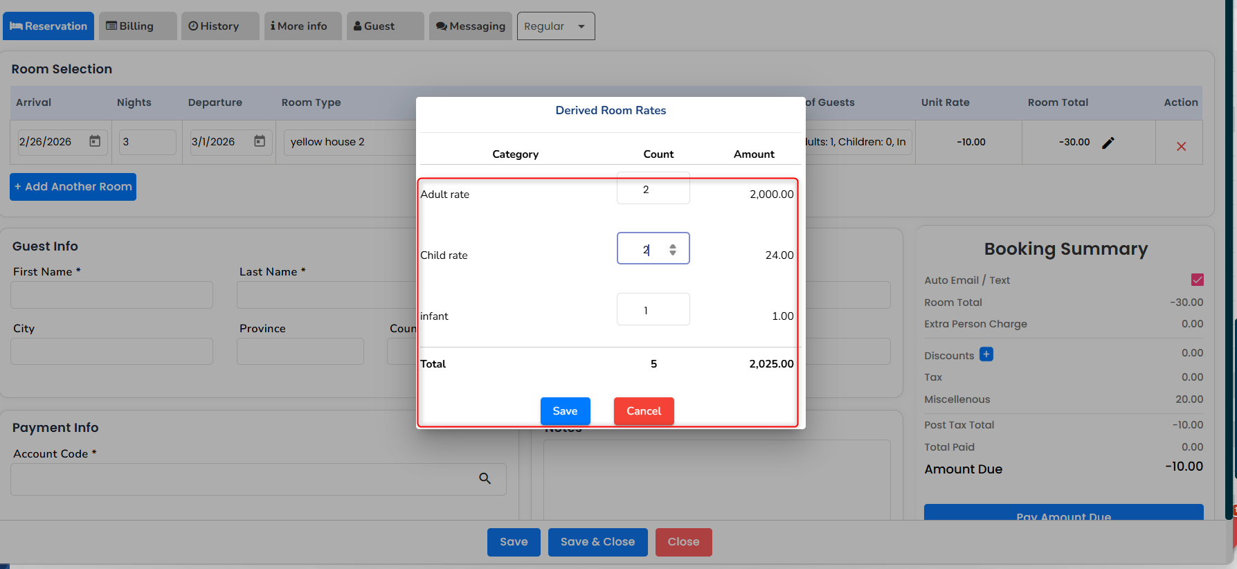 Calculates the total room rate for the reservation - After entering the numbers, click Save.